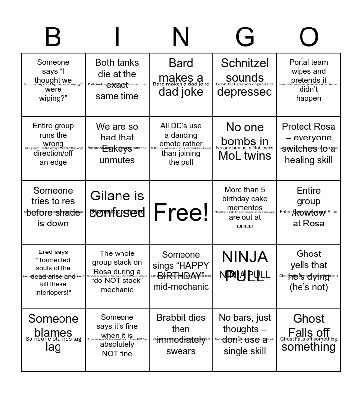 This bingo card has 24 images, a free space and 24 words: The whole group stack on Rosa during a “do NOT stack” mechanic, Someone says it’s fine when it is absolutely NOT fine, All DD’s use a dancing emote rather than joining the pull, Someone blames lag, Portal team wipes and pretends it didn’t happen, Someone says “I thought we were wiping?”, Entire group runs the wrong direction/off an edge, Both tanks die at the exact same time, More than 5 birthday cake mementos are out at once, Someone sings “HAPPY BIRTHDAY” mid-mechanic, No one bombs in MoL twins, Someone tries to res before shade is down, NINJA PULL, Ghost yells that he’s dying (he’s not), We are so bad that Eakeys unmutes, No bars, just thoughts – don’t use a single skill, Entire group /kowtow at Rosa, Bard makes a dad joke, Protect Rosa – everyone switches to a healing skill, Gilane is confused, Ghost Falls off something, Ered says "Tormented souls of the dead arise and kill these interlopers!", Schnitzel sounds depressed and Brabbit dies then immediately swears.
