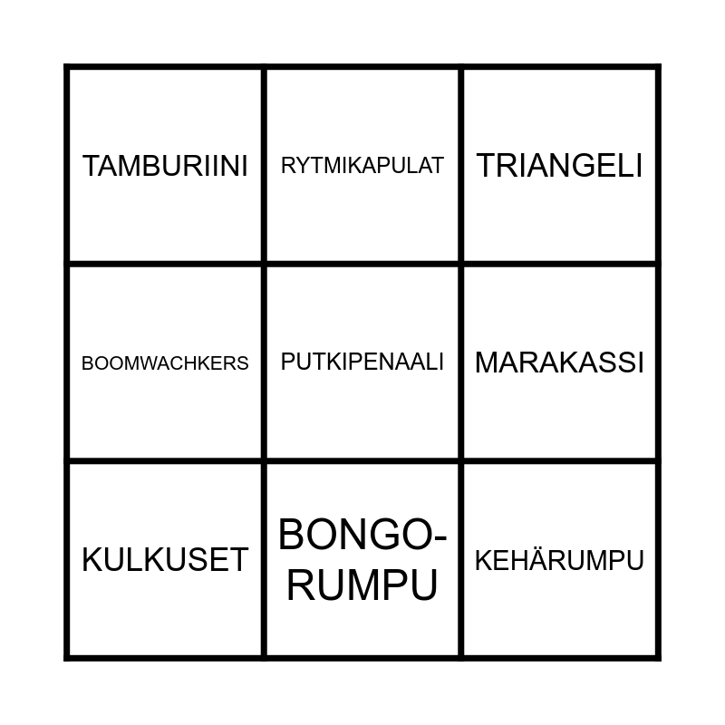 This bingo card has a free space and 8 words: MARAKASSI, TRIANGELI, RYTMIKAPULAT, KULKUSET, TAMBURIINI, KEHÄRUMPU, BOOMWACHKERS and BONGO-RUMPU.