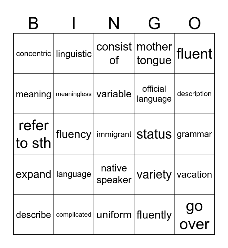 This bingo card has 49 words: vocabulary, immigrant, exchange student, uniform, language, linguist, linguistic, mean, meaning, meaningful, meaningless, mother tongue, vacation, variety, vary, various, variable, status, bilingual, fluent, fluency, fluently, concentric, official language, foreign language, description, describe, descriptive, native speaker, expand, model, propose, professor, chemist's, complicated, consonant, vowel, copy, grammar, be able to do sth, translate sth into sth, look up, go over, pick up, refer to sth, consist of, be filled with sth, be confident about sth and copy sth (from sth) into/onto sth.