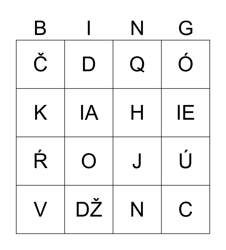 This bingo card has 48 words: A, V, Á, Ň, T, E, D, CH, IA, ô, H, Ó, Z, Š, Ľ, Y, IE, DŽ, N, K, Ú, ä, Č, Ŕ, R, O, S, Ť, B, C, Ž, I, É, G, Ĺ, C, DZ, N, P, Ú, X, U, Q, IU, J, Í, Ý and F.