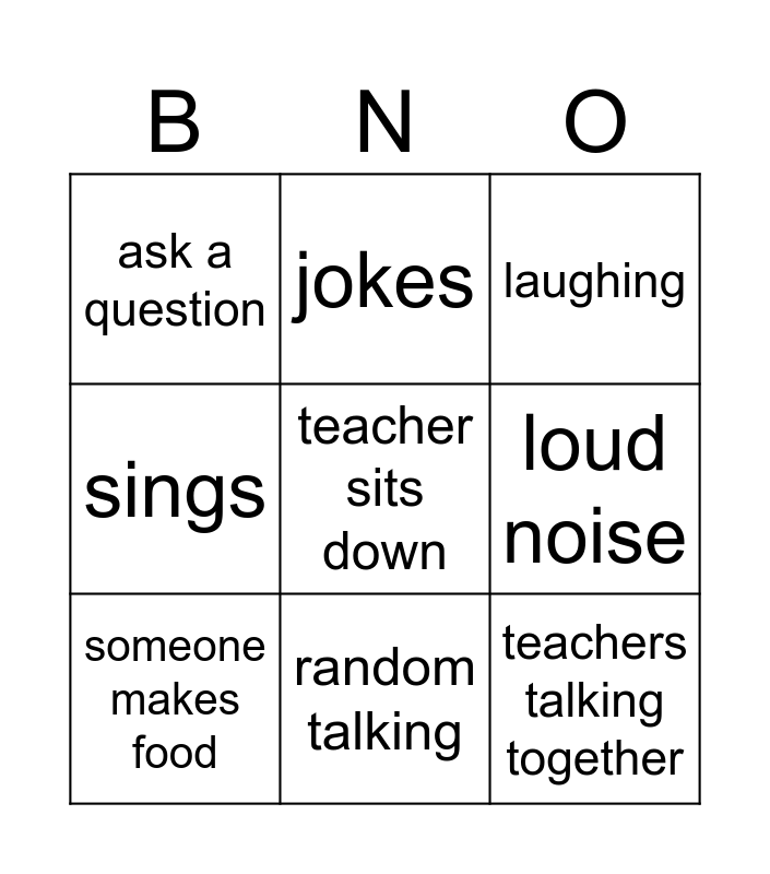 This bingo card has a free space and 8 words: loud noise, laughing, jokes, someone makes food, ask a question, teachers talking together, sings and random talking.