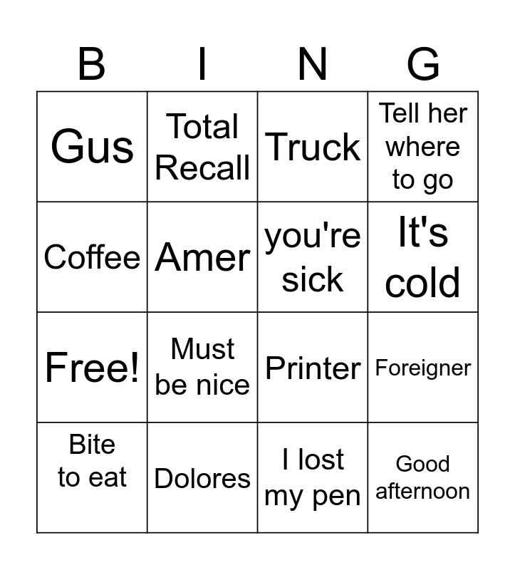 This bingo card has 20 words: Foreigner, Shred, Truck, Armstrong, Bite to eat, Coffee, Dolores, Gus, Free!, Total Recall, Must be nice, Printer, Amer, Good afternoon, you're sick, Trump, It's cold, Tell her where to go, I lost my pen and Good afternoon.