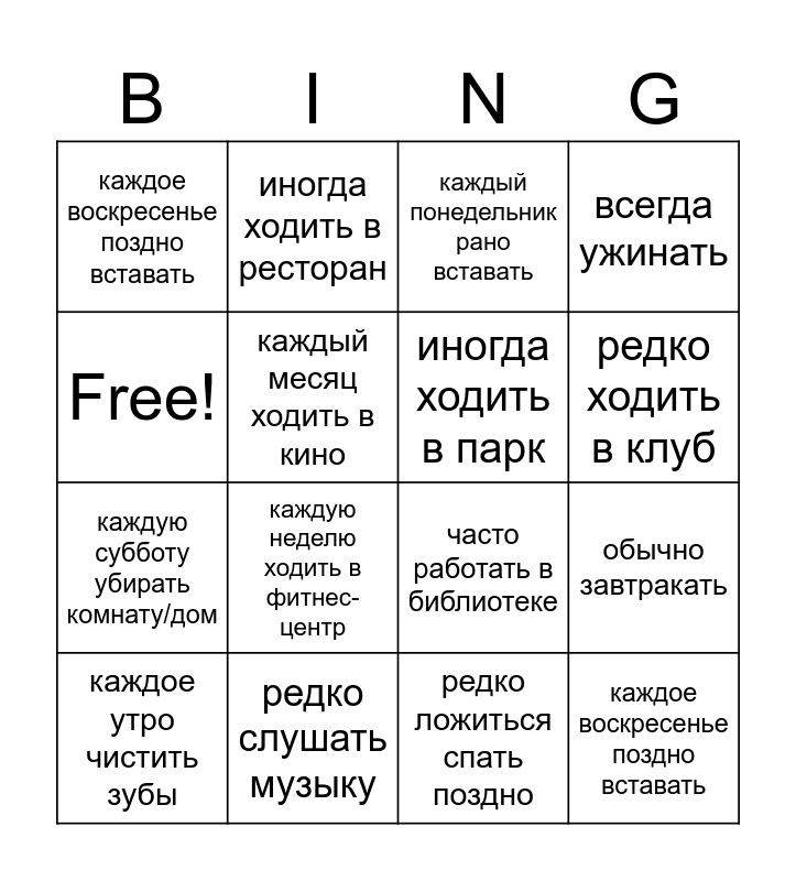 This bingo card has 16 words: редко слушать музыку, обычно завтракать, каждый понедельник рано вставать, каждое воскресенье поздно вставать, каждую субботу убирать комнату/дом, иногда ходить в ресторан, часто работать в библиотеке, редко ложиться спать поздно, Free!, каждый месяц ходить в кино, каждое утро чистить зубы, всегда ужинать, каждую неделю ходить в фитнес-центр, редко ходить в клуб, иногда ходить в парк and каждое воскресенье поздно вставать.