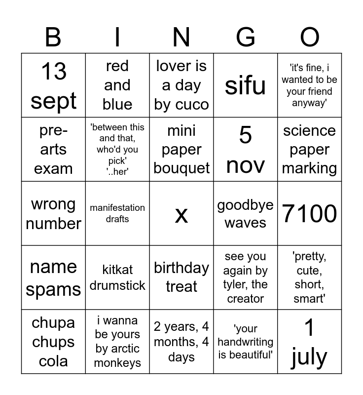 This bingo card has a free space and 24 words: kitkat drumstick, i wanna be yours by arctic monkeys, mini paper bouquet, chupa chups cola, 'it's fine, i wanted to be your friend anyway', 13 sept, pre-arts exam, red and blue, goodbye waves, birthday treat, 5 nov, wrong number, see you again by tyler, the creator, 'pretty, cute, short, smart', 'between this and that, who'd you pick' '..her', 'your handwriting is beautiful', 7100, lover is a day by cuco, science paper marking, manifestation drafts, 1 july, name spams, sifu and 2 years, 4 months, 4 days.