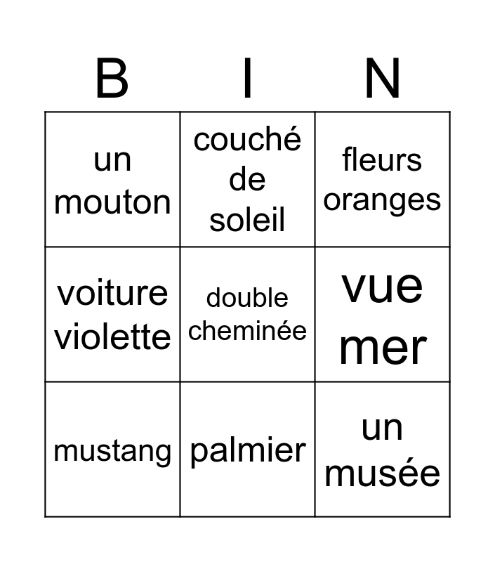 This bingo card has a free space and 8 words: vue mer, fleurs oranges, couché de soleil, mustang, un mouton, un musée, voiture violette and palmier.