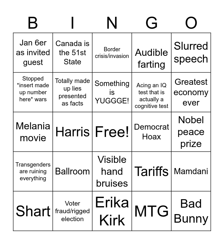 This bingo card has a free space and 33 words: Biden, Obama, Harris, Hillary, Transgenders are ruining everything, Totally made up lies presented as facts, Slurred speech, Shart, Canada is the 51st State, Greenland, Something is YUGGGE!, Border crisis/invasion, Prescription drug prices down 1500%, Fake News, Democrat Hoax, Greatest economy ever, Voter fraud/rigged election, Melania movie, Ballroom, Tariffs, Visible hand bruises, Healthiest president ever, Jan 6er as invited guest, Nobel peace prize, Erika Kirk, Bad Bunny, Audible farting, Acing an IQ test that is actually a cognitive test, Stopped *insert made up number here* wars, Mamdani, AOC, MTG and Big Beautiful Bill.