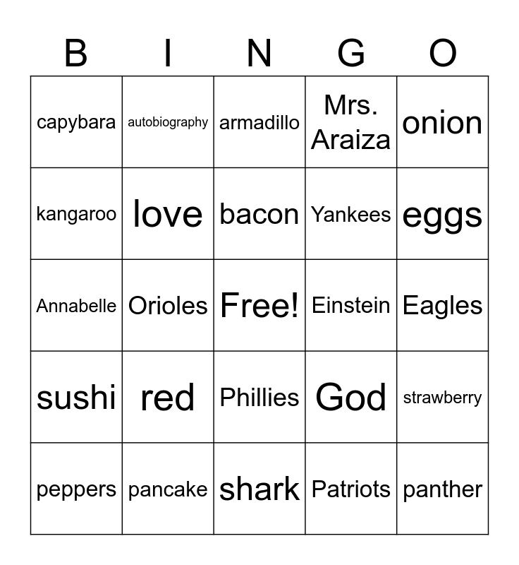 This bingo card has a free space and 24 words: red, pancake, bacon, peppers, onion, capybara, kangaroo, autobiography, Einstein, Phillies, Yankees, Annabelle, God, strawberry, love, Patriots, Eagles, armadillo, eggs, Orioles, panther, sushi, Mrs. Araiza and shark.