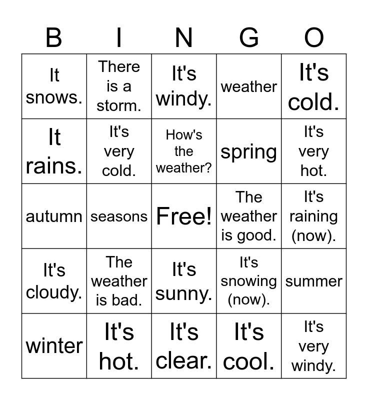 This bingo card has a free space and 26 words: It's sunny., It's cool., How's the weather?, It's hot., It's cold., It snows., It rains., There is a storm., It's raining (now)., It's snowing (now)., spring, autumn, summer, winter, seasons, season, weather, It's cloudy., It's windy., It's very windy., It's very hot., It's clear., The weather is good., The weather is bad., It's very cold. and It's really sunny..