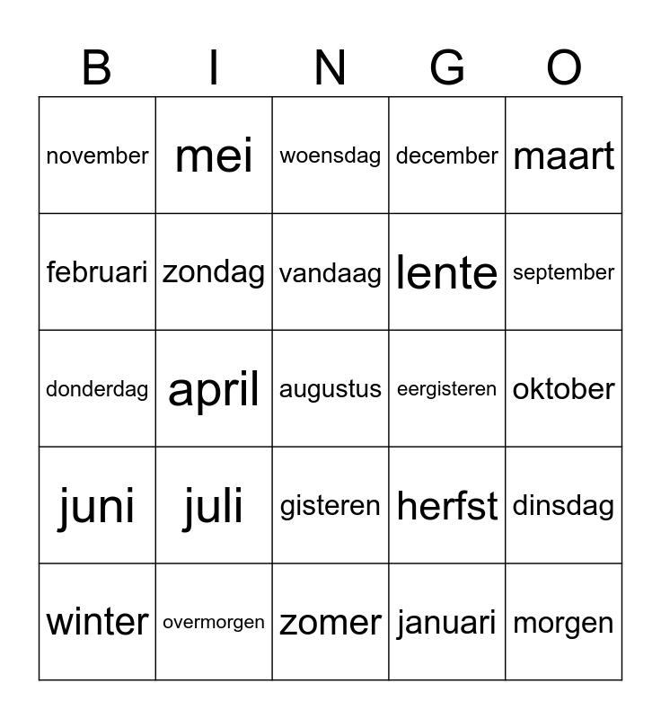 This bingo card has a free space and 24 words: juli, overmorgen, vandaag, winter, maart, november, februari, mei, eergisteren, gisteren, lente, donderdag, herfst, dinsdag, zondag, januari, oktober, woensdag, september, april, morgen, juni, december and zomer.