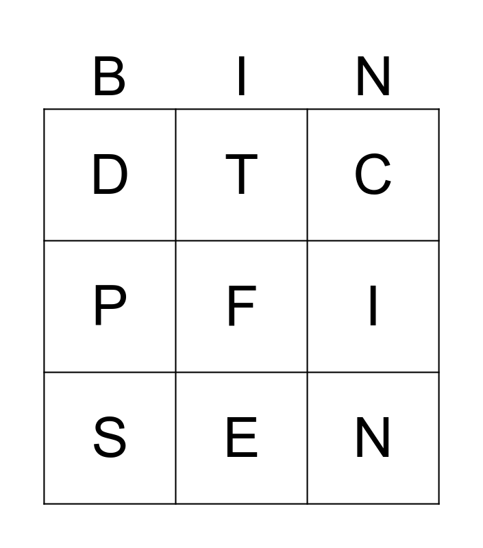 This bingo card has 15 words: A, B, C, D, E, F, G, H, I, N, O, P, S, T and U.