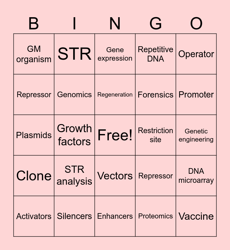 This bingo card has a free space and 29 words: Activators, DNA profiling, Growth factors, Genomics, GM organism, Gene expression, Genomics, STR analysis, Restriction site, Silencers, Genetic engineering, Vaccine, Enhancers, Proteomics, Promoter, DNA Ligase, Vectors, Clone, Operator, Plasmids, Repressor, Operon, Forensics, Repressor, Repetitive DNA, STR, DNA microarray, Regeneration and Therapeutic coloning.