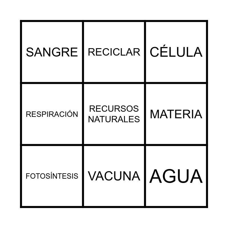 This bingo card has 1 images and 39 words: SALUD, CÉLULA, ECOSISTEMA, FOTOSÍNTESIS, MATERIA, VACUNA, CONTAMINACIÓN, RECURSOS NATURALES, PLANTA, ALIMENTO, RESPIRACIÓN, MOVIMIENTO, CALOR, SOL, MANOS, CORAZÓN, SANGRE, SALUD, CÉLULA, ECOSISTEMA, FOTOSÍNTESIS, AGUA, MATERIA, VACUNA, CONTAMINACIÓN, RECURSOS NATURALES, PLANTA, ALIMENTO, RESPIRACIÓN, MOVIMIENTO, CALOR, SOL, MANOS, CORAZÓN, SANGRE, HUESOS, MÚSCULOS, RECICLAR and LIMPIO.