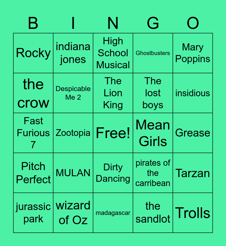 This bingo card has a free space and 40 words: Titanic, Fast Furious 7, Footloose, Despicable Me 2, wizard of Oz, Dirty Dancing, The Lion King, Shrek, Mary Poppins, Pitch Perfect, Zootopia, Ghostbusters, Trolls, Grease, Mean Girls, MULAN, Chicken little, Rocky, Top Gun, High School Musical, Tarzan, the sandlot, The lost boys, the crow, Hairspray, burlesque, beauty and the beast, Harry Potter, transformers, Star Wars, greatest showman, jurassic park, halloween, pirates of the carribean, insidious, madagascar, Karate Kid, 8 mile, indiana jones and Edward scissor hands.