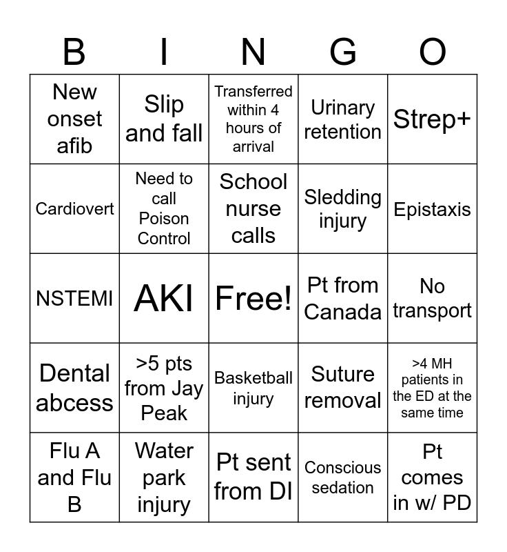 This bingo card has a free space and 24 words: >5 pts from Jay Peak, Water park injury, School nurse calls, Flu A and Flu B, Strep+, New onset afib, Cardiovert, Slip and fall, Pt from Canada, Basketball injury, Sledding injury, NSTEMI, Suture removal, >4 MH patients in the ED at the same time, Need to call Poison Control, Conscious sedation, No transport, Transferred within 4 hours of arrival, Epistaxis, AKI, Pt comes in w/ PD, Dental abcess, Urinary retention and Pt sent from DI.