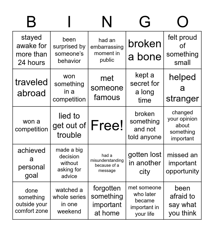 This bingo card has a free space and 31 words: forgotten something important at home, traveled alone to another city, lied to get out of trouble, tried food from a country you’ve never visited, stayed awake for more than 24 hours, had an embarrassing moment in public, won something in a competition, gotten lost in another city, broken something and not told anyone, met someone who later became important in your life, changed your opinion about something important, been afraid to say what you think, learned something from a big mistake, done something you immediately regretted, helped a stranger, argued with a close friend and fixed it later, missed an important opportunity, made a big decision without asking for advice, achieved a personal goal, had a misunderstanding because of a message, felt proud of something small, faced a difficult situation alone, done something outside your comfort zone, been surprised by someone’s behavior, kept a secret for a long time, traveled abroad, broken a bone, won a competition, watched a whole series in one weekend, met someone famous and gone to a party alone.