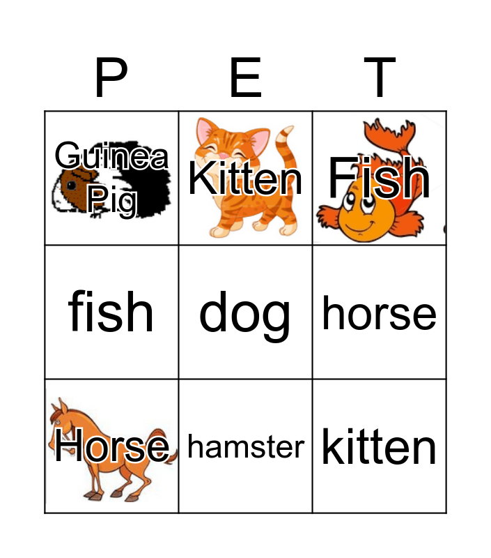 This bingo card has 9 images and 21 words: Hamster, Turtle, Kitten, Bird, Dog, Horse, Guinea Pig, Fish, Cat, hamster, kitten, fish, bird, cow, horse, sheep, rabbit, tortoise, dog, chicken and cat.