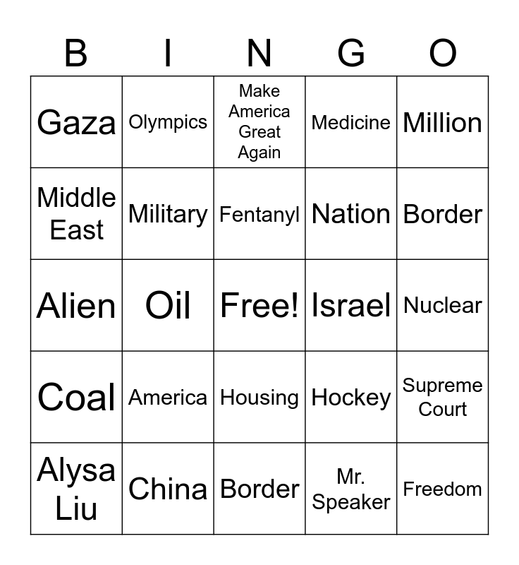 This bingo card has a free space and 24 words: America, China, Fentanyl, Alysa Liu, Million, Gaza, Middle East, Olympics, Israel, Housing, Nation, Alien, Hockey, Supreme Court, Military, Mr. Speaker, Nuclear, Make America Great Again, Border, Oil, Freedom, Coal, Medicine and Border.
