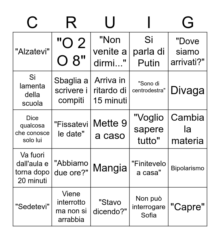 This bingo card has 65 words: Sbaglia registro, Riaccede al registro più volte, "Non voglio sapere tutto", Bipolarismo, Spiegazione effettivamente interessante, Si scorda di interrogare, "O 2 O 8", "Porco diaz", Arriva in ritardo di 15 minuti, Interroga anche se non doveva, Mangia, Si parla di epstein, Cambia la materia, "Dove siamo arrivati?", "Pompa", Si lamenta della scuola, "Fissatevi le date", "Alzatevi", Mette 2 a caso, "Sono di centrodestra", "Abbiamo due ore?", Va fuori dall'aula e torna dopo 20 minuti, Si parla di Putin, Si inventa una storia assurda, "Io sono filoamericano", Sbatte la cattedra, Daddo e Cristian sono malati, "Si vede la mappa?", Mette 9 a caso, "State scrivendo?", "Sedetevi", Non finiamo il video, "Basta così", "Ma è suonata?", "Finitevelo a casa", Viene interrotto ma non si arrabbia, manda a prendere un tè, Dice qualcosa che conosce solo lui, Non può interrogare Sofia, Chiede aiuto per il pc/la lim, Sbaglia a scrivere i compiti, Video, "Voglio sapere tutto", "Quante ore abbiamo?", "O 3 O 7", Telefonata, Divaga, Viola sta calando, "Capre", Libro ellettronico, "Non scrivete", "Va' l'audio?, Pregia una figura storica, "Stavo dicendo?", Andiamo fuori, Batteria della bici, Si lamenta dell'Italia, "Non venite a dirmi...", Scambia Sofia con Viola o viceversa, "Che succede?", Consiglia un libro a Viola, "Come ci sono arrivato?", Extra- comunitario, "Animali!" and Il passaporto.