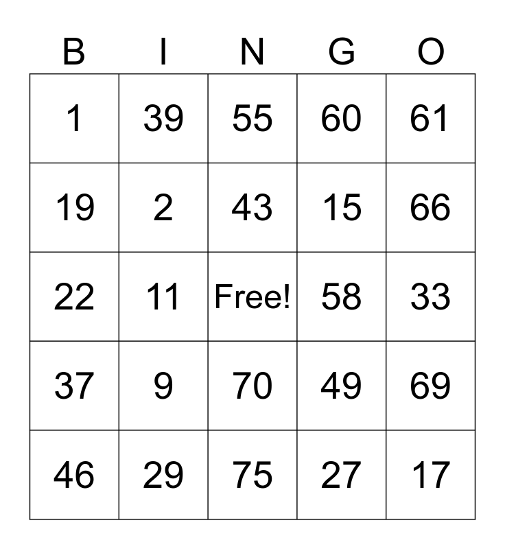 This bingo card has a free space and 24 words: 9, 29, 43, 46, 61, 1, 19, 39, 58, 70, 15, 22, 49, 69, 2, 27, 33, 55, 66, 11, 17, 37, 60 and 75.