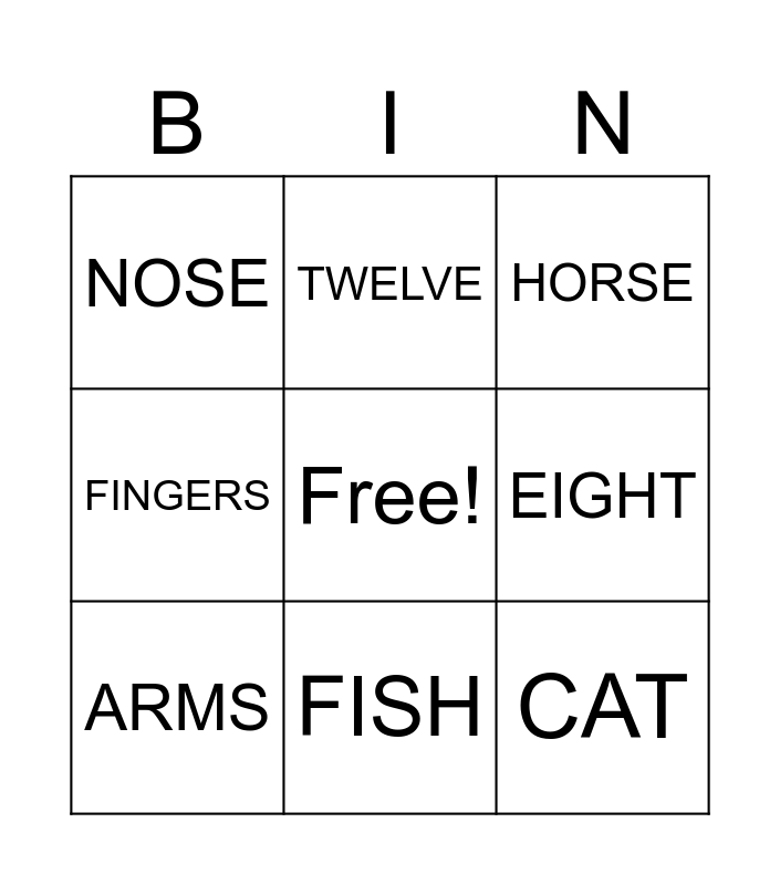 This bingo card has a free space and 56 words: FACE, HEAD, EYES, NOSE, EARS, MOUTH, ARMS, LEGS, FEET, HAND, FINGERS, LONG, SHORT, TALL, BIG, SMALL, CAT, DOG, SNAKE, MONKEY, FROG, COW, SHEEP, HORSE, PARROT, FISH, CAN, CAN'T, ONE, TWO, THREE, FOUR, FIVE, SIX, SEVEN, EIGHT, NINE, TEN, ELEVEN, TWELVE, THIRTEEN, FOURTEEN, FIFTEEN, SIXTEEN, SEVENTEEN, EIGHTEEN, NINETEEN, TWENTY, JUMP, SING, SWIM, TALK, WALK, CLIMB, RUN and FLY.