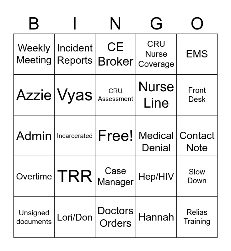 This bingo card has a free space and 24 words: Unsigned documents, TRR, CRU Assessment, Hannah, EMS, Weekly Meeting, Incident Reports, CE Broker, Medical Denial, Contact Note, Admin, Vyas, Hep/HIV, Slow Down, Azzie, Lori/Don, Doctors Orders, CRU Nurse Coverage, Front Desk, Overtime, Incarcerated, Case Manager, Nurse Line and Relias Training.