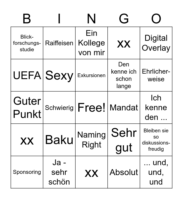 This bingo card has a free space and 24 words: Baku, Ja - sehr schön, Exkursionen, Sponsoring, Digital Overlay, Blick-forschungs-studie, UEFA, Raiffeisen, Mandat, Naming Right, Den kenne ich schon lange, Guter Punkt, Sehr gut, Bleiben sie so diskussions-freudig, Sexy, Absolut, Ich kenne den ..., Ein Kollege von mir, Ehrlicher-weise, Schwierig, ... und, und, und, xx, xx and xx.