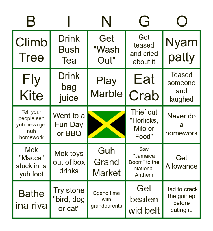 This bingo card has a free space and 24 words: Bathe ina riva, Mek toys out of box drinks, Play Marble, Get beaten wid belt, Nyam patty, Climb Tree, Drink Bush Tea, Get "Wash Out", Thief out "Horlicks, Milo or Food", Never do a homework, Tell your people seh yuh neva get nuh homework, Drink bag juice, Say "Jamaica Boom" to the National Anthem, Get Allowance, Fly Kite, Try stone "bird, dog or cat", Spend time with grandparents, Got teased and cried about it, Teased someone and laughed, Mek "Macca" stuck inna yuh foot, Went to a Fun Day or BBQ, Guh Grand Market, Eat Crab and Had to crack the guinep before eating it..