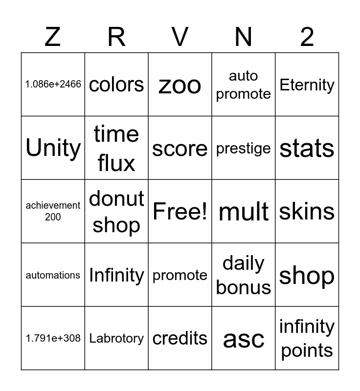 This bingo card has a free space and 24 words: Infinity, Labrotory, score, 1.791e+308, Eternity, 1.086e+2466, Unity, colors, mult, promote, prestige, achievement 200, daily bonus, shop, time flux, asc, skins, zoo, stats, donut shop, infinity points, automations, auto promote and credits.
