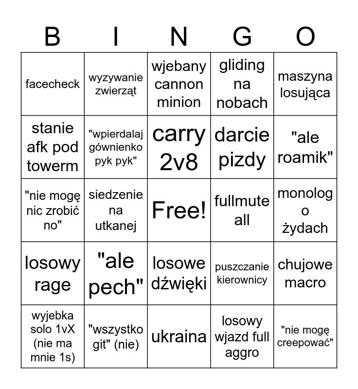 This bingo card has a free space and 24 words: "ale pech", "wszystko git" (nie), carry 2v8, wyjebka solo 1vX (nie ma mnie 1s), maszyna losująca, facecheck, stanie afk pod towerm, wyzywanie zwierząt, fullmute all, losowe dźwięki, darcie pizdy, "nie mogę nic zrobić no", puszczanie kierownicy, chujowe macro, "wpierdalaj gównienko pyk pyk", losowy wjazd full aggro, monolog o żydach, wjebany cannon minion, "ale roamik", siedzenie na utkanej, "nie mogę creepować", losowy rage, gliding na nobach and ukraina.