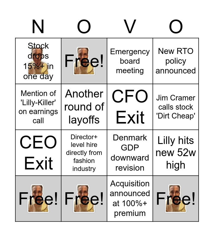 This bingo card has 5 images and 16 words: Free!, Lilly hits new 52w high, Emergency board meeting, Stock drops 15%+ in one day, CEO Exit, Free!, Denmark GDP downward revision, Acquisition announced at 100%+ premium, Mention of 'Lilly-Killer' on earnings call, Another round of layoffs, Free!, New RTO policy announced, Director+ level hire directly from fashion industry, Jim Cramer calls stock 'Dirt Cheap', CFO Exit and Free!.