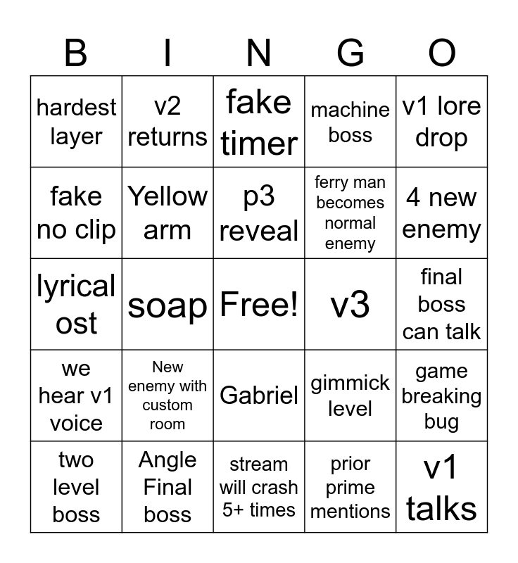 This bingo card has a free space and 24 words: New enemy with custom room, Angle Final boss, p3 reveal, two level boss, v1 lore drop, hardest layer, fake no clip, v2 returns, v3, Gabriel, ferry man becomes normal enemy, lyrical ost, gimmick level, game breaking bug, Yellow arm, prior prime mentions, final boss can talk, fake timer, 4 new enemy, soap, v1 talks, we hear v1 voice, machine boss and stream will crash 5+ times.