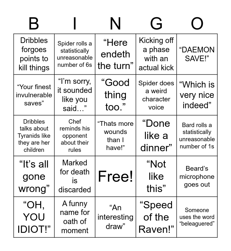 This bingo card has 26 words: Free!, “Speed of the Raven!”, “Good thing too.”, A funny name for oath of moment, “DAEMON SAVE!”, Dribbles forgoes points to kill things, “Your finest invulnerable saves”, Spider rolls a statistically unreasonable number of 6s, Bard rolls a statistically unreasonable number of 1s, “Not like this”, Spider does a weird character voice, Dribbles talks about Tyranids like they are her children, Beard’s microphone goes out, “OH, YOU IDIOT!”, Chef reminds his opponent about their rules, Rerolling into a worse result, Kicking off a phase with an actual kick, “It’s all gone wrong”, “Here endeth the turn”, “Thats more wounds than I have!”, “Which is very nice indeed”, “An interesting draw”, “Done like a dinner”, Marked for death is discarded, “I’m sorry, it sounded like you said…” and Someone uses the word “beleaguered”.