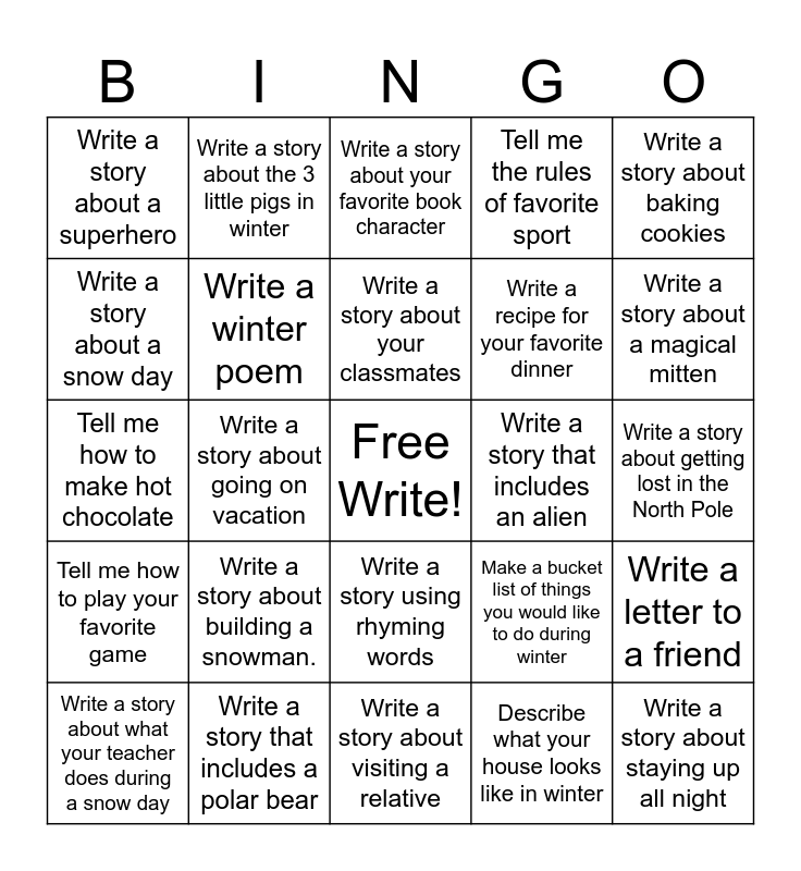 This bingo card has a free space and 24 words: Write a story about building a snowman., Write a story that includes a polar bear, Write a story about your classmates, Write a story about what your teacher does during a snow day, Write a story about baking cookies, Write a story about a superhero, Write a story about a snow day, Write a story about the 3 little pigs in winter, Write a story that includes an alien, Write a story using rhyming words, Write a recipe for your favorite dinner, Tell me how to make hot chocolate, Make a bucket list of things you would like to do during winter, Write a letter to a friend, Write a winter poem, Describe what your house looks like in winter, Write a story about getting lost in the North Pole, Write a story about your favorite book character, Write a story about a magical mitten, Write a story about going on vacation, Write a story about staying up all night, Tell me how to play your favorite game, Tell me the rules of favorite sport and Write a story about visiting a relative.