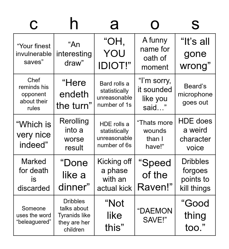 This bingo card has 25 words: “Done like a dinner”, “Not like this”, Bard rolls a statistically unreasonable number of 1s, Someone uses the word “beleaguered”, “It’s all gone wrong”, “Your finest invulnerable saves”, Chef reminds his opponent about their rules, “An interesting draw”, “Thats more wounds than I have!”, Kicking off a phase with an actual kick, “I’m sorry, it sounded like you said…”, “Which is very nice indeed”, “Speed of the Raven!”, Dribbles forgoes points to kill things, “Here endeth the turn”, “Good thing too.”, HDE does a weird character voice, “OH, YOU IDIOT!”, Beard’s microphone goes out, Rerolling into a worse result, HDE rolls a statistically unreasonable number of 6s, Dribbles talks about Tyranids like they are her children, Marked for death is discarded, A funny name for oath of moment and “DAEMON SAVE!”.