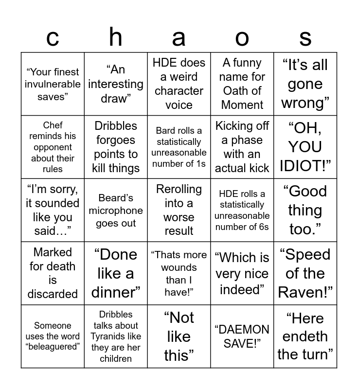 This bingo card has 25 words: “Done like a dinner”, “Not like this”, Bard rolls a statistically unreasonable number of 1s, Someone uses the word “beleaguered”, “It’s all gone wrong”, “Your finest invulnerable saves”, Chef reminds his opponent about their rules, “An interesting draw”, HDE rolls a statistically unreasonable number of 6s, “Thats more wounds than I have!”, Kicking off a phase with an actual kick, “I’m sorry, it sounded like you said…”, “Which is very nice indeed”, “Speed of the Raven!”, Dribbles forgoes points to kill things, “Here endeth the turn”, “Good thing too.”, HDE does a weird character voice, “OH, YOU IDIOT!”, Beard’s microphone goes out, Rerolling into a worse result, Dribbles talks about Tyranids like they are her children, Marked for death is discarded, A funny name for Oath of Moment and “DAEMON SAVE!”.