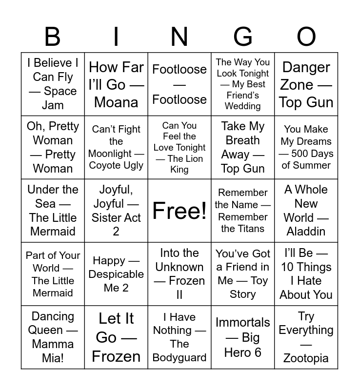 This bingo card has a free space and 94 words: Gonna Fly Now — Rocky, I Will Always Love You — The Bodyguard, I Have Nothing — The Bodyguard, Shallow — A Star Is Born (2018), Hopelessly Devoted to You — Grease, You’re the One That I Want — Grease, What a Feeling — Flashdance, Dancing Queen — Mamma Mia!, Lay All Your Love on Me — Mamma Mia!, Skyfall — Skyfall, Writing’s on the Wall — Spectre, Lose Yourself — 8 Mile, All the Stars — Black Panther, Take My Breath Away — Top Gun, Eye of the Tiger — Rocky III, Danger Zone — Top Gun, Footloose — Footloose, Maniac — Flashdance, Don’t You (Forget About Me) — The Breakfast Club, Unchained Melody — Ghost, Stayin’ Alive — Saturday Night Fever, Purple Rain — Purple Rain, My Heart Will Go On — Titanic, I Don’t Want to Miss a Thing — Armageddon, Happy — Despicable Me 2, Can’t Fight the Moonlight — Coyote Ugly, This Is Me — The Greatest Showman, A Thousand Years — The Twilight Saga: Breaking Dawn, See You Again — Furious 7, Heathens — Suicide Squad, Let It Go — Frozen, Into the Unknown — Frozen II, We Don’t Talk About Bruno — Encanto, Surface Pressure — Encanto, How Far I’ll Go — Moana, You’re Welcome — Moana, Circle of Life — The Lion King, Hakuna Matata — The Lion King, Can You Feel the Love Tonight — The Lion King, You’ve Got a Friend in Me — Toy Story, Under the Sea — The Little Mermaid, Part of Your World — The Little Mermaid, A Whole New World — Aladdin, Friend Like Me — Aladdin, Try Everything — Zootopia, Life Is a Highway — Cars, Everything Is Awesome — The Lego Movie, Can’t Stop the Feeling — Trolls, Rewrite the Stars — The Greatest Showman, Accidentally in Love — Shrek 2, I’m a Believer — Shrek, Immortals — Big Hero 6, Remember Me — Coco, Un Poco Loco — Coco, When Will My Life Begin? — Tangled, Go the Distance — Hercules, Zero to Hero — Hercules, I Will Follow Him — Sister Act, Shout — Sister Act, Hail Holy Queen — Sister Act, Joyful, Joyful — Sister Act 2, Oh Happy Day — Sister Act 2, Angel — Click, Linger — Click, If I Could Turn Back Time — Click, Everybody Hurts — Click, Time After Time — Click, Changes — Click, Oh, Pretty Woman — Pretty Woman, It Must Have Been Love — Pretty Woman, Kiss Me — She’s All That, When You Say Nothing at All — Notting Hill, She — Notting Hill, I Say a Little Prayer — My Best Friend’s Wedding, The Way You Look Tonight — My Best Friend’s Wedding, Stay (I Missed You) — Reality Bites, Lovefool — Romeo + Juliet, You Make My Dreams — 500 Days of Summer, I’ll Be — 10 Things I Hate About You, Head Over Feet — 10 Things I Hate About You, Dreams — You’ve Got Mail, We Are the Champions — The Mighty Ducks, We Will Rock You — The Mighty Ducks, Remember the Name — Remember the Titans, I Believe I Can Fly — Space Jam, All Star — The Replacements, The Final Countdown — Rocky IV, Thunderstruck — Varsity Blues, Let’s Get It Started — The Blind Side, Born to Be Wild — D2: The Mighty Ducks, Don’t Stop Believin’ — Monster, Hall of Fame — The Karate Kid (2010), Stronger — Never Back Down and Centuries — The Waterboy.