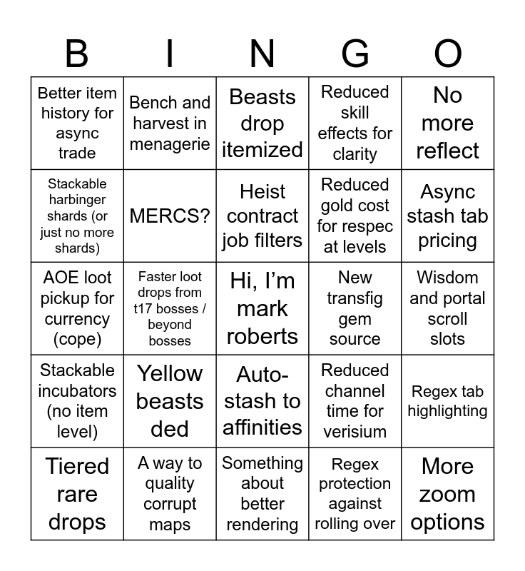 This bingo card has a free space and 24 words: Yellow beasts ded, A way to quality corrupt maps, Heist contract job filters, Tiered rare drops, No more reflect, Better item history for async trade, Stackable harbinger shards (or just no more shards), Bench and harvest in menagerie, New transfig gem source, Auto-stash to affinities, Reduced gold cost for respec at levels, AOE loot pickup for currency (cope), Reduced channel time for verisium, Regex tab highlighting, MERCS?, Regex protection against rolling over, Wisdom and portal scroll slots, Beasts drop itemized, Async stash tab pricing, Faster loot drops from t17 bosses / beyond bosses, More zoom options, Stackable incubators (no item level), Reduced skill effects for clarity and Something about better rendering.