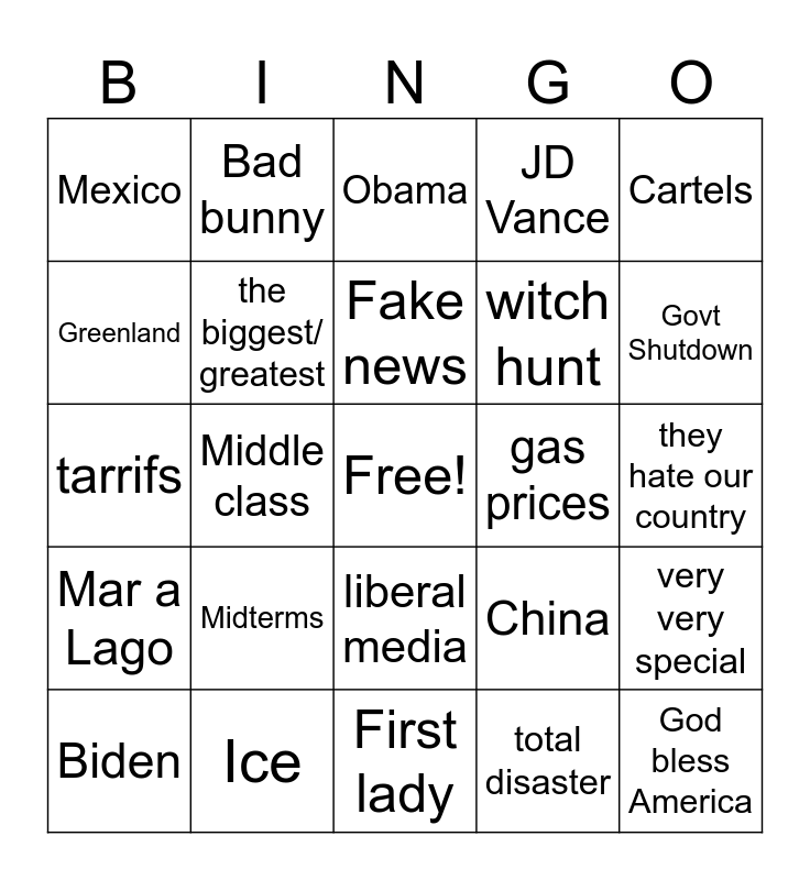 This bingo card has a free space and 24 words: Midterms, Ice, Fake news, Biden, Cartels, Mexico, Greenland, Bad bunny, gas prices, liberal media, witch hunt, tarrifs, China, very very special, the biggest/ greatest, total disaster, they hate our country, Obama, Govt Shutdown, Middle class, God bless America, Mar a Lago, JD Vance and First lady.