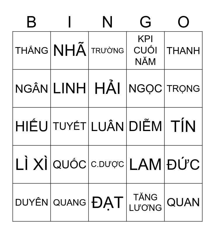 This bingo card has 25 words: QUỐC, ĐẠT, HẢI, DUYÊN, THANH, THẮNG, NGÂN, NHÃ, DIỄM, C.DƯỢC, NGỌC, HIẾU, LAM, ĐỨC, LINH, QUAN, TÍN, TRƯỜNG, TRỌNG, TUYẾT, LUÂN, QUANG, LÌ XÌ, KPI CUỐI NĂM and TĂNG LƯƠNG.