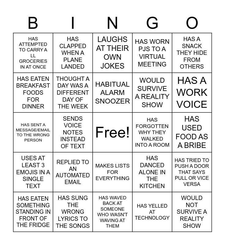 This bingo card has a free space and 24 words: HAS EATEN SOMETHING STANDING IN FRONT OF THE FRIDGE, REPLIED TO AN AUTOMATED EMAIL, HABITUAL ALARM SNOOZER, HAS YELLED AT TECHNOLOGY, HAS A SNACK THEY HIDE FROM OTHERS, HAS ATTEMPTED TO CARRY ALL GROCERIES IN AT ONCE, HAS CLAPPED WHEN A PLANE LANDED, LAUGHS AT THEIR OWN JOKES, HAS FORGOTTEN WHY THEY WALKED INTO A ROOM, HAS USED FOOD AS A BRIBE, HAS SENT A MESSAGE/EMAIL TO THE WRONG PERSON, THOUGHT A DAY WAS A DIFFERENT DAY OF THE WEEK, HAS DANCED ALONE IN THE KITCHEN, HAS TRIED TO PUSH A DOOR THAT SAYS PULL OR VICE VERSA, HAS EATEN BREAKFAST FOODS FOR DINNER, HAS SUNG THE WRONG LYRICS TO THE SONGS, HAS WAVED BACK AT SOMEONE WHO WASN'T WAVING AT THEM, HAS WORN PJS TO A VIRTUAL MEETING, HAS A WORK VOICE, USES AT LEAST 3 EMOJIS IN A SINGLE TEXT, SENDS VOICE NOTES INSTEAD OF TEXT, MAKES LISTS FOR EVERYTHING, WOULD SURVIVE A REALITY SHOW and WOULD NOT SURVIVE A REALITY SHOW.