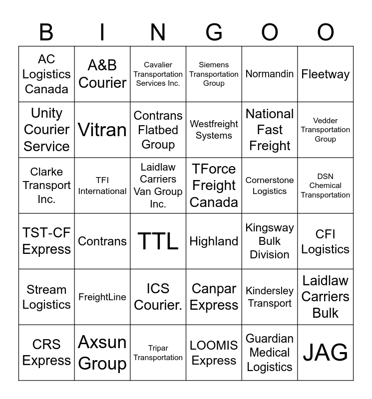 This bingo card has 36 words: Canpar Express, ICS Courier., LOOMIS Express, Unity Courier Service, TST‑CF Express, TForce Freight Canada, Vitran, Tripar Transportation, Normandin, Kindersley Transport, Vedder Transportation Group, Siemens Transportation Group, Laidlaw Carriers Bulk, TFI International, Westfreight Systems, AC Logistics Canada, Stream Logistics, Cornerstone Logistics, Clarke Transport Inc., Cavalier Transportation Services Inc., Laidlaw Carriers Van Group Inc., Contrans, Highland, TTL, Kingsway Bulk Division, A&B Courier, National Fast Freight, Axsun Group, Contrans Flatbed Group, Fleetway, JAG, CRS Express, CFI Logistics, DSN Chemical Transportation, FreightLine and Guardian Medical Logistics.