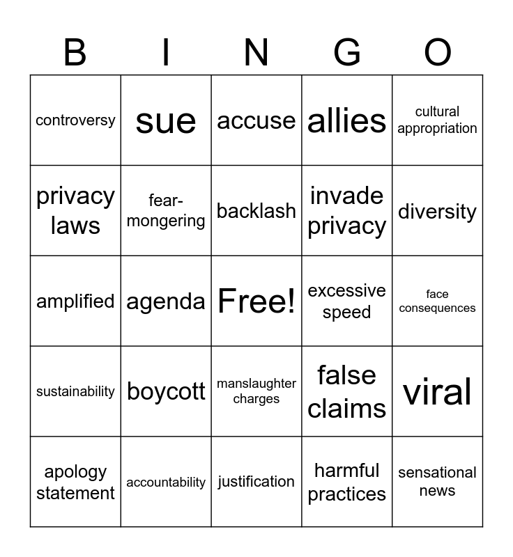 This bingo card has a free space and 24 words: boycott, accountability, backlash, apology statement, cultural appropriation, controversy, privacy laws, sue, excessive speed, manslaughter charges, invade privacy, amplified, false claims, viral, fear-mongering, harmful practices, face consequences, accuse, diversity, agenda, sensational news, sustainability, allies and justification.