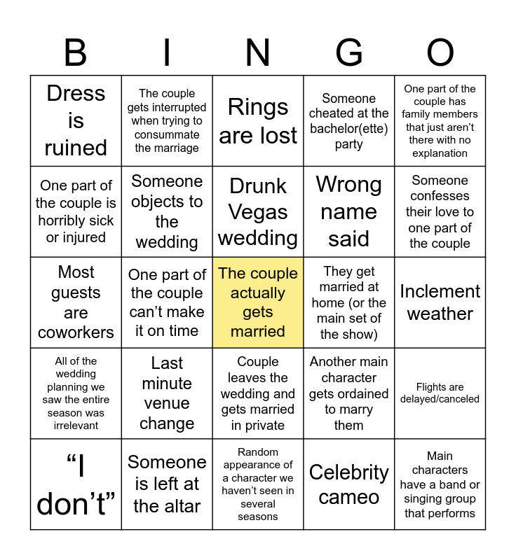 This bingo card has a free space and 24 words: Last minute venue change, Someone is left at the altar, Drunk Vegas wedding, “I don’t”, One part of the couple has family members that just aren’t there with no explanation, Dress is ruined, One part of the couple is horribly sick or injured, The couple gets interrupted when trying to consummate the marriage, They get married at home (or the main set of the show), Couple leaves the wedding and gets married in private, Wrong name said, Most guests are coworkers, Another main character gets ordained to marry them, Flights are delayed/canceled, Someone objects to the wedding, Celebrity cameo, Inclement weather, Rings are lost, Someone confesses their love to one part of the couple, One part of the couple can’t make it on time, Main characters have a band or singing group that performs, All of the wedding planning we saw the entire season was irrelevant, Someone cheated at the bachelor(ette) party and Random appearance of a character we haven’t seen in several seasons.