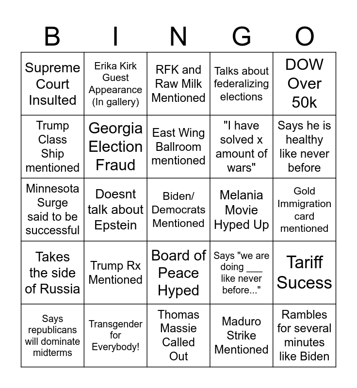 This bingo card has a free space and 24 words: Trump Rx Mentioned, Transgender for Everybody!, East Wing Ballroom mentioned, Says republicans will dominate midterms, DOW Over 50k, Supreme Court Insulted, Trump Class Ship mentioned, Erika Kirk Guest Appearance (In gallery), Melania Movie Hyped Up, Board of Peace Hyped, "I have solved x amount of wars", Minnesota Surge said to be successful, Says "we are doing ___ like never before...", Tariff Sucess, Georgia Election Fraud, Maduro Strike Mentioned, Gold Immigration card mentioned, RFK and Raw Milk Mentioned, Says he is healthy like never before, Doesnt talk about Epstein, Rambles for several minutes like Biden, Takes the side of Russia, Talks about federalizing elections and Thomas Massie Called Out.