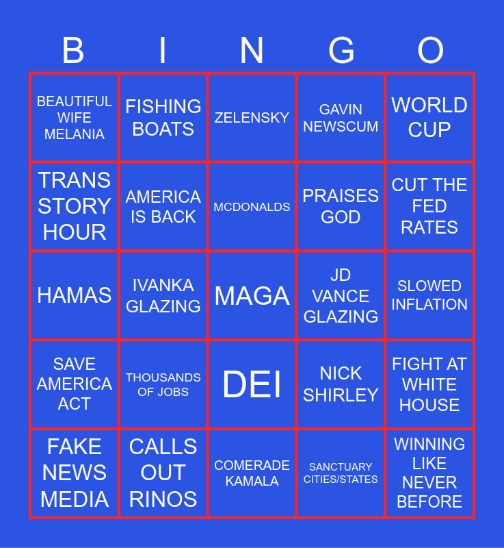 This bingo card has a free space and 84 words: BILLIONS AND BILLIONS, CHYYYNA, ZELENSKY, REAL GOOD FRIEND, NATO, SLEEPY JOE, TARIFFS, OLYMPIC HOCKEY, CANADA, CARTELS, GREENLAND, VENEZUELA, AMERICA IS BACK, JD VANCE GLAZING, $2,000, BEAUTIFUL WIFE MELANIA, FAKE NEWS MEDIA, TRANS STORY HOUR, LUNATIC LEFTISTS, KASH PATEL GLAZING, SECURE BORDER, PRAISES GOD, WINNING LIKE NEVER BEFORE, NOBEL PRIZE, IVANKA GLAZING, EPSTEIN, DOES THE DANCE, TREMENDOUS, INCREDIBLE MEN & WOMEN, 250TH BIRTHDAY, THOUSANDS OF JOBS, AYATOLLAH ALI KHAMENEI, GREAT BRITAIN, HAMAS, ISRAEL, RIPPING AMERICA OFF, COMERADE KAMALA, DOW IS HIGHER, CUT THE FED RATES, SAVE AMERICA ACT, BOARD OF PEACE, FREEDOM OF SPEECH, ATTACK ON CHURCHES, EUROPE HAS FALLEN, I HAVE SO MANY FRIENDS, FORMER PRINCE ANDREW, FISHING BOATS, DRILL BABY DRILL, DEPORTING ILLEGALS, TIM WALZ, ASSASSINATION, NICK SHIRLEY, GAVIN NEWSCUM, EBT FRAUD, WINNING TOO MUCH, *DEMS INTERRUPT SPEECH*, CALLS OUT RINOS, MCDONALDS, FULTON COUNTY 2020, SLOWED INFLATION, AL GREEN EJECTED AGAIN, PAM BONDI GLAZING, SPEECH OVER 100 MINUTES, SPEECH UNDER 100 MINUTES, MAKE AMERICA HEALTHY AGAIN, PUBLIC SCHOOL INDOCTRINATION, TAKING CARE OF VETERANS, ANTIFA, WORLD CUP, ONE NATION, UNDER GOD, FIGHT AT WHITE HOUSE, CRYPTO, GOVERNMENT SHUTDOWN, MARIJUANA RESCHEDULE, DEI, SANCTUARY CITIES/STATES, ALIENS, AUTO INDUSTRY, JAN 6 PATRIOTS, MAR A LAGO, EXECUTIVE ORDER, B2 BOMBERS, ELON MUSK and DEPT OF TRANSPORTATION.