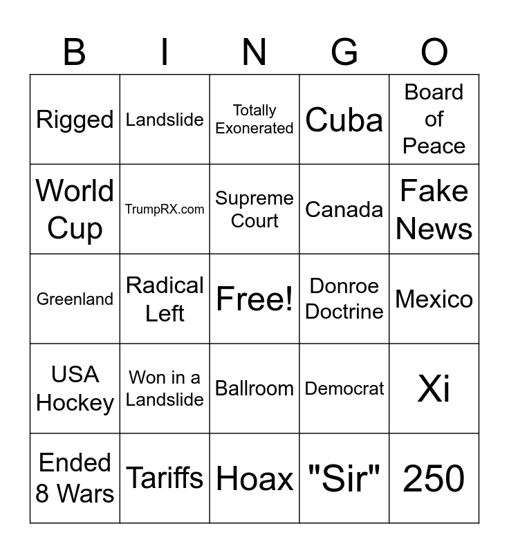 This bingo card has a free space and 29 words: Ended 8 Wars, Dow 50k, Radical Left, Billions and Billions, Rigged, Totally Exonerated, TrumpRX.com, Won in a Landslide, Donroe Doctrine, Tariffs, Mexico, 250, Hoax, "Sir", Fake News, Barack Hussein Obama, Ballroom, USA Hockey, Board of Peace, Greenland, Democrat, Inflation, Canada, World Cup, Cuba, Landslide, Xi, Supreme Court and Iran.