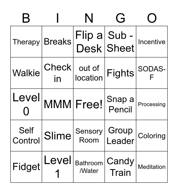 This bingo card has a free space and 29 words: Awol, Level 1, Flip a Desk, Fun Friday, Incentive, Therapy, Check in, out of location, Snap a Pencil, Coloring, Fidget, MMM, Candy Train, Meditation, Level 0, hallway transition, Bathroom /Water, Group Leader, SODAS-F, Self Control, Slime, Fidgets, Fights, Processing, Walkie, Breaks, Sensory Room, Sub - Sheet and Frozen.