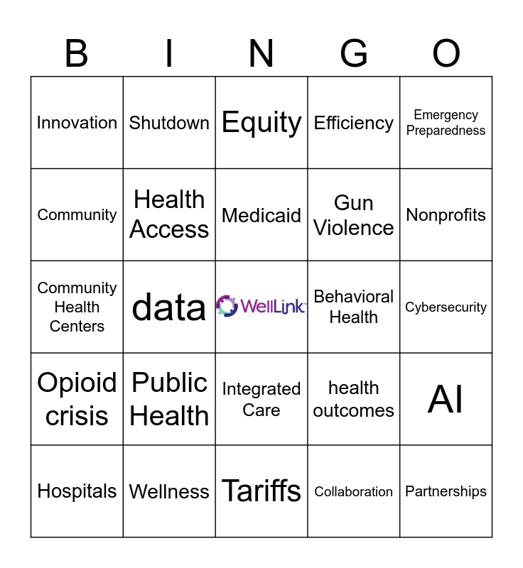 This bingo card has a free space and 34 words: Healthcare, Collaboration, Health Workforce, Home Health, Opioid crisis, Health Access, Emergency Preparedness, Hospitals, Shutdown, Social Drivers, Medicaid, Equity, Aging America, Supply Chain, Behavioral Health, Nonprofits, Wellness, Community Health Centers, Public Health, health outcomes, Integrated Care, Sustainability, Innovation, Cybersecurity, Tariffs, Partnerships, Efficiency, Coverage, Gun Violence, Community, longterm care, data, AI and Reimbursement.