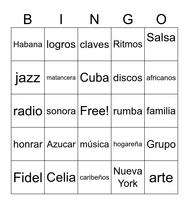 This bingo card has a free space and 24 words: Azucar, Celia, Cuba, Fidel, Salsa, Habana, jazz, logros, rumba, música, discos, radio, hogareña, Grupo, matancera, Nueva York, familia, claves, africanos, sonora, arte, honrar, Ritmos and caribeños.