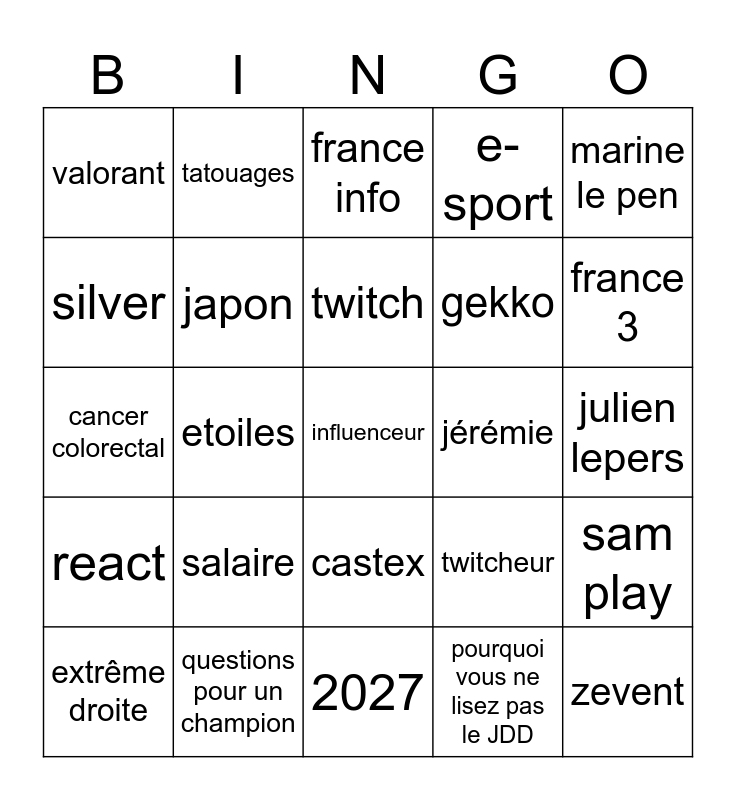 This bingo card has a free space and 24 words: salaire, questions pour un champion, twitch, extrême droite, marine le pen, valorant, silver, tatouages, jérémie, castex, gekko, cancer colorectal, twitcheur, sam play, japon, pourquoi vous ne lisez pas le JDD, julien lepers, france info, france 3, etoiles, zevent, react, e-sport and 2027.